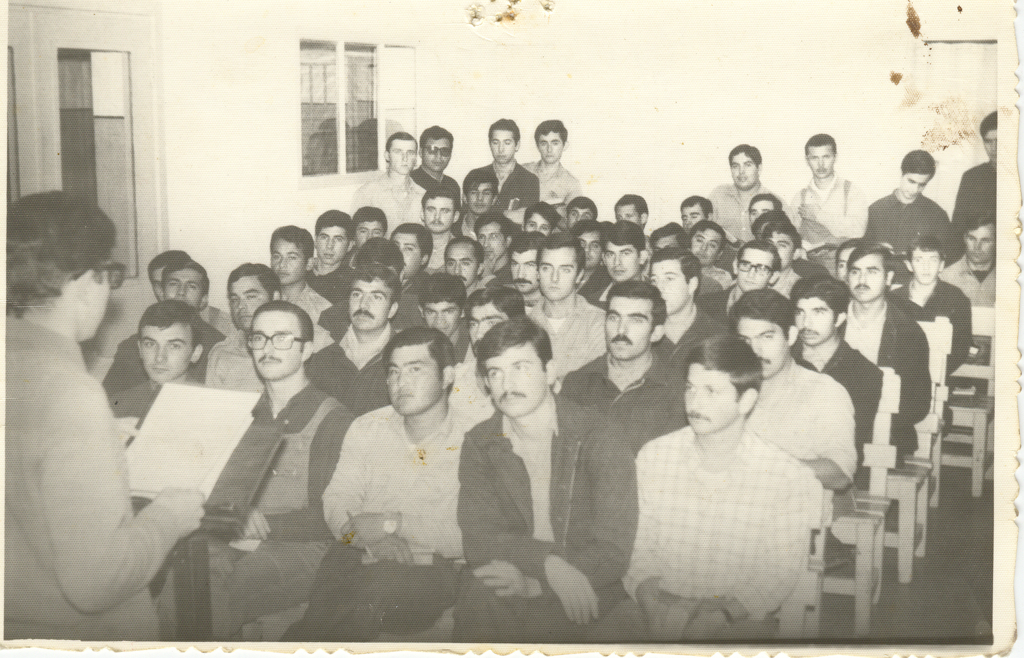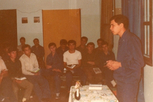 Foto 06: Año 1985. Pabellón 5 alto, en el comedor. Disertante: 5063: IRIBARREN Juan Carlos, 1963. Segun relata 4902: PONCE, Carlos Alberto, 1961; "El atril que se ve en la fotografía fue armado en el penal, con componentes que se consiguieron allí o se llevaron cuando regresaban de franco. La parte donde el disertante tiene apoyada su mano derecha era una tapa de acero inoxidable de una heladera."
