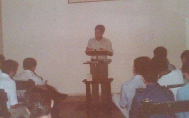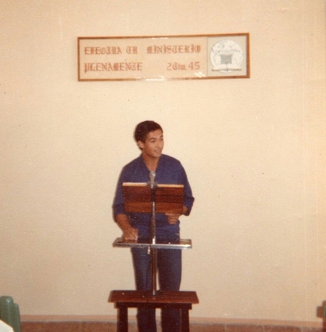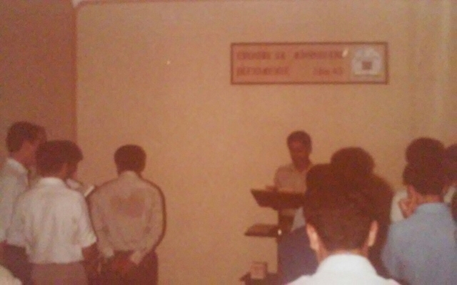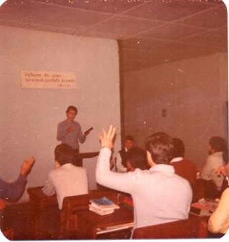 Foto 03: Año 1985. Lugar: Pabellón 5 alto, Comedor 5 Alto. Reunión de la Escuela del Ministerio Teocrático y Reunión de Servicio. En el atril Víctor Peralta. Se aprecia el cartel con el texto del año.